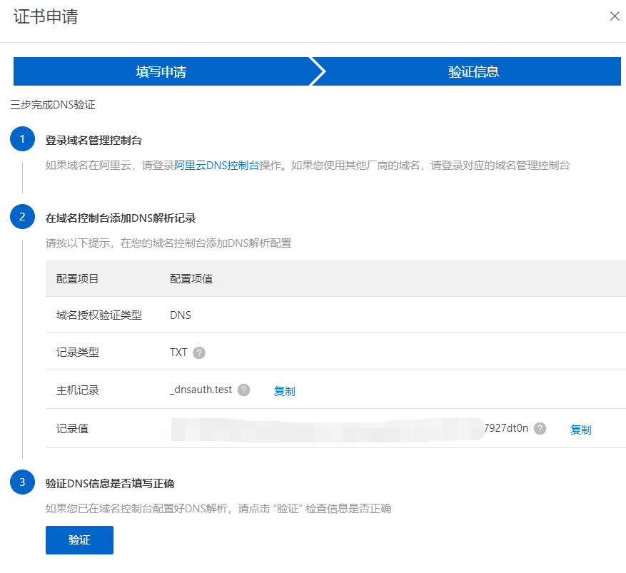 4.点击验证和申请审核后,基本过一会审核就会通过,记录你得到的证书信息,去域名解析添加解析内容