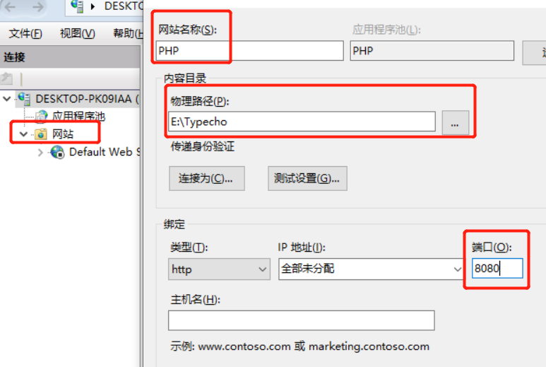 右击网站,选择添加网站.我们填入网站名称,对应Typecho 的路径,和端口即可(不推荐使用80端口)